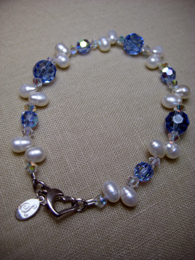 White tear drop pearls with light sapphire and clear Swarovski crystals with a sterling silver heart shaped lobster clasp, approx. 7.25” long.