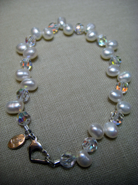 White tear drop pearls and clear Swarovski crystals with a sterling silver heart shaped lobster clasp, approx. 7.25” long.