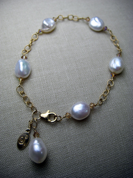 Baroque pearls with Swarovski crystals wrapped with 14K gold filled wire and chain with a 14K gold filled lobster clasp, approx. 7.25” long, $110.